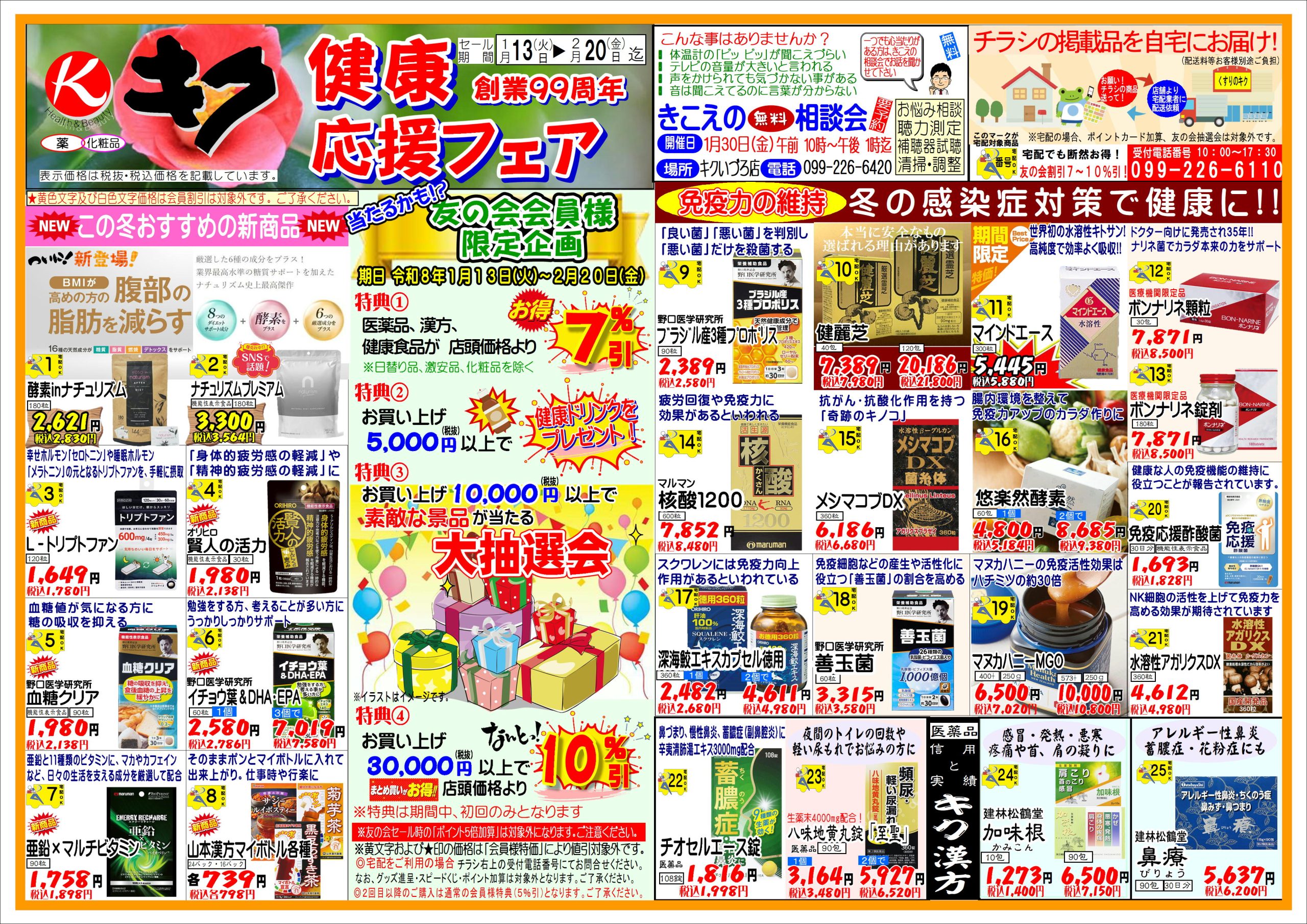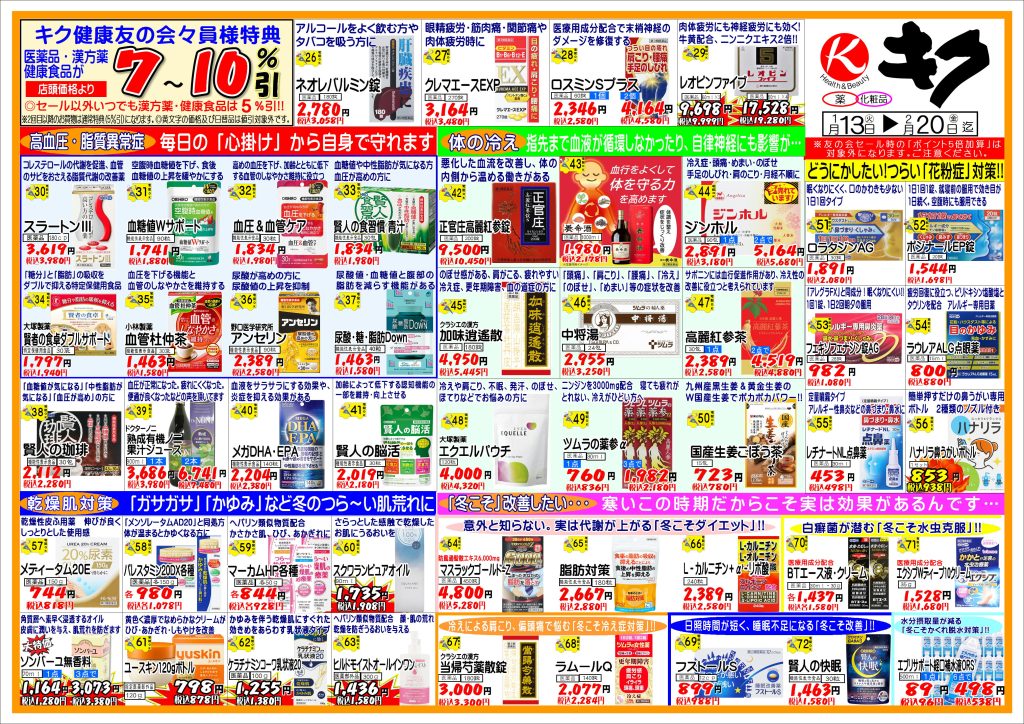 健康応援フェア開催中!! 2026/01/13 本日1/13(火)~2/20(金)の期間、 キクいづろ店にて、健康応援フェアを開催中です。 素敵な景品が当たる友の会会員様限定の大抽選会も開催いたします。 キクファミリーカード、健康友の会の新規会員様も募集中です。ぜひご入会ください! お申込は、キク薬舗各店店頭にて、スタッフにお気軽にお問い合わせください。 季節のおすすめ商品や会員様限定の日替り奉仕品などお得な情報が満載のチラシをぜひご覧ください。